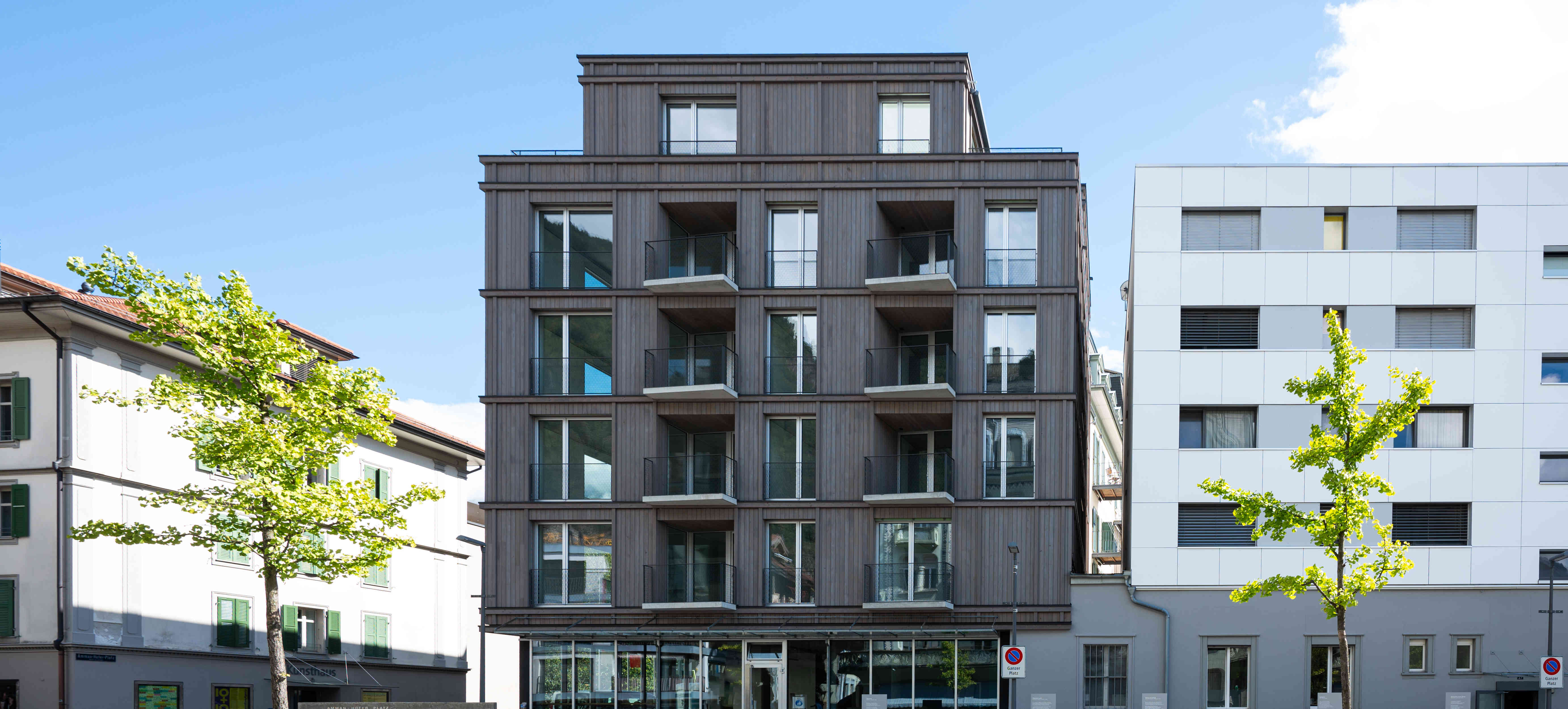 Das Projekt „Wohnhaus J44“ zeigt, wie moderne Architektur in Holz eine gute Einpassung ins Ortsbild erreichen kann. Es entstanden 13 qualitätsvolle Mietwohnungen im Zentrum von Interlaken. Vom Bestandsgebäude konnte das Keller- und Ladengeschoss erhalten werden. Den Zielen einer nachhaltigen Bauwirtschaft, die die graue Energie im Bestand erhalten und schonen will konnte entsprochen werden. Die Aufstockung in Holzbauweise ist nachhaltig und ressourcenschonend, da sie weniger Energie und Material verbraucht als herkömmliche Bauweisen. Die gesamte Fassadenbekleidung wurde in druckimprägnierter Schweizer Tanne erstellt. Das Projekt ist ein Beispiel für die Potenziale des Holzbaus in urbanen Räumen.