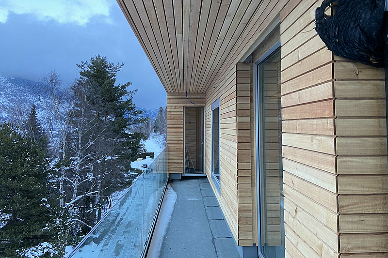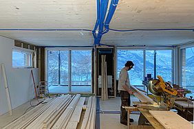 Mitarbeitende der wenger holzbau ag arbeiten Ende Januar 2021 auf einer Baustelle in Termen im Kanton Wallis. Vor Ort entsteht ein wunderschönes Zweifamilienhaus. Die Schalung der Fassadenbekleidung besteht aus 100%- einheimischem Walliser-Lärchenholz.