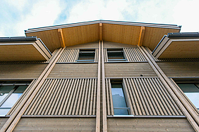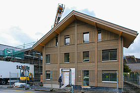 Die Mitarbeitenden der wenger holzbau ag führen die umfangreichen Holzbauarbeiten aus. Ein erster wichtiger Meilenstein ist bereits erreicht. Das erste Haus konnte vom Gerüst befreit werden und zeigt nun seine charakteristische Holzfassade.